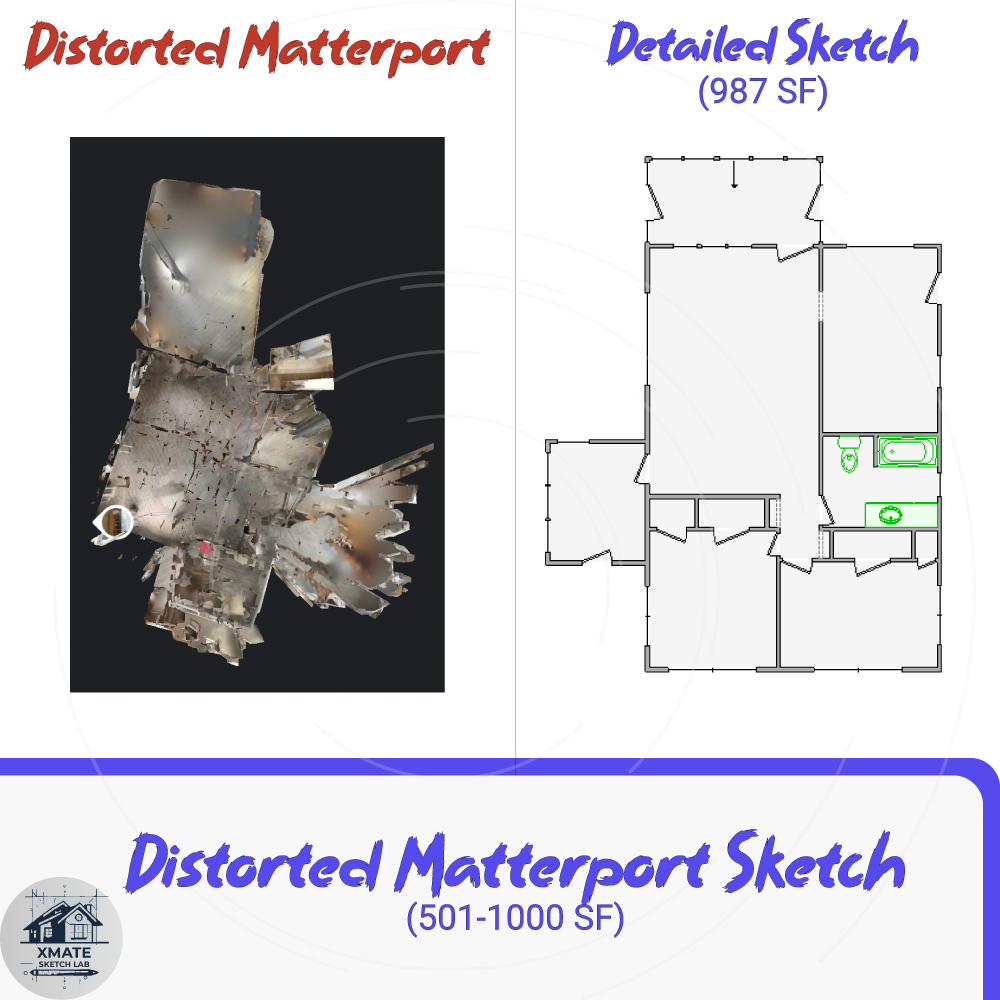 At XMATE Sketch Lab, we specialize in transforming problematic and distorted matterport scans into clear, accurate sketches. In this case, our team worked with a residential property of 987 sq ft, where the original scan presented multiple challenges.
